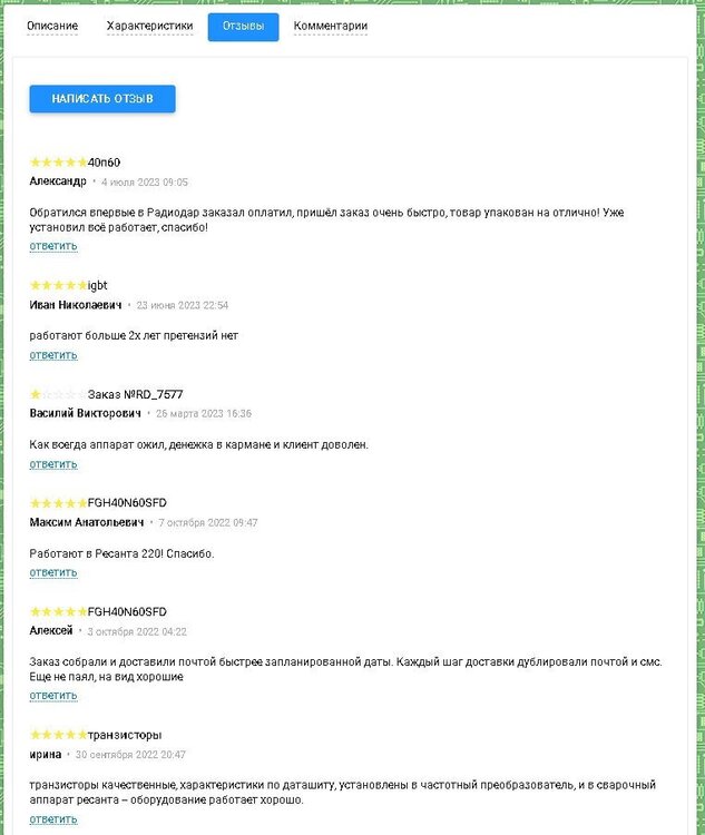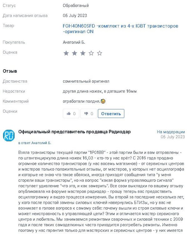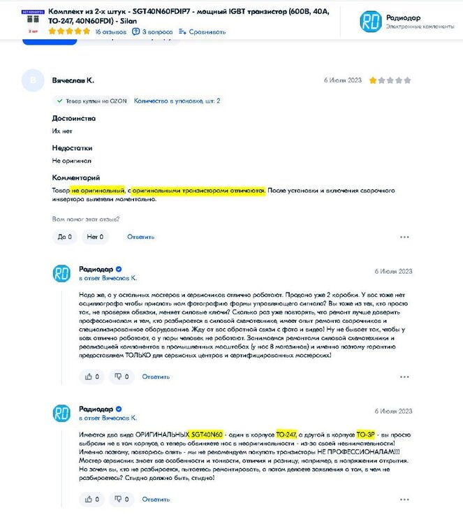 19. Второй случай произошел 06 июля: очередной супер мастер купил у нас транзисторы и оставил отзыв, основываясь на отличие корпусов приобретенных транзисторов от тех, которые были установлены: Как в итоге оказалось - человек не разбирается в электротехнике силовой и сварочной аппаратуры, не имеет опыта ремонтов сварочников, но решил купить силовые ключи для самостоятельной замены. Да вот на свою голову спутал корпуса транзисторов: в данного производителя есть транзисторы в обоих видах корпусов, в ТО-247 и в ТО-3Р! БРАВО! Но зато своё экспертное мнение надо оставить - это же "не оригиналы"! Ну и что, что у него нет осциллографа, какая еще обвязка - "что вы вообще мне голову морочите..." ЕЩЕ РАЗ БОЛЬШИМИ БУКВАМИ: ГАРАНТИЯ ТОЛЬКО ДЛЯ СЕРВИСНЫХ ЦЕНТРОВ И МАСТЕРСКИХ!!!