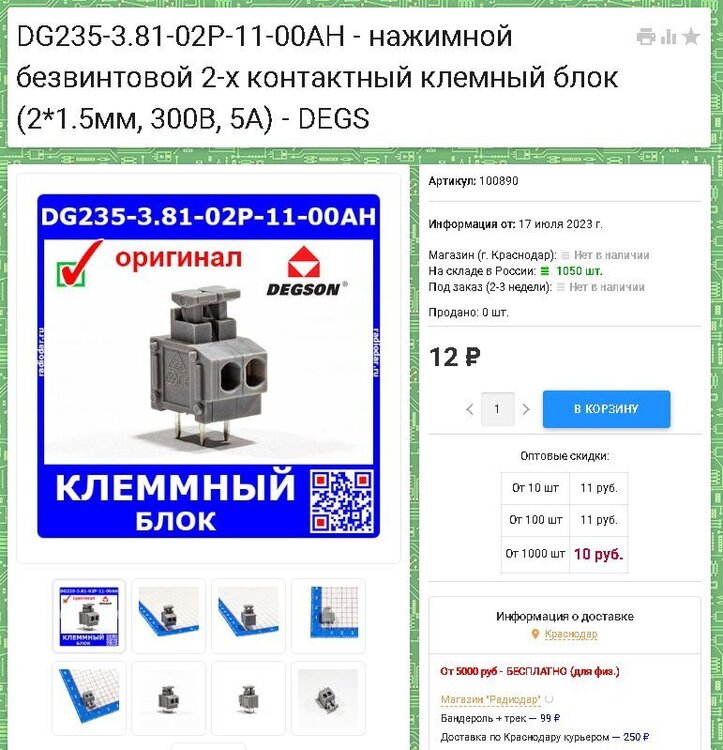 13. Буквально сегодня еще раз спрашивали, выставили - теперь в продаже: DG235-3.81-02P-11-00AH - нажимной безвинтовой 2-х контактный клемный блок (2*1.5мм, 300В, 5А) - DEGS Цена: от 10 руб/шт. --- Ссылка