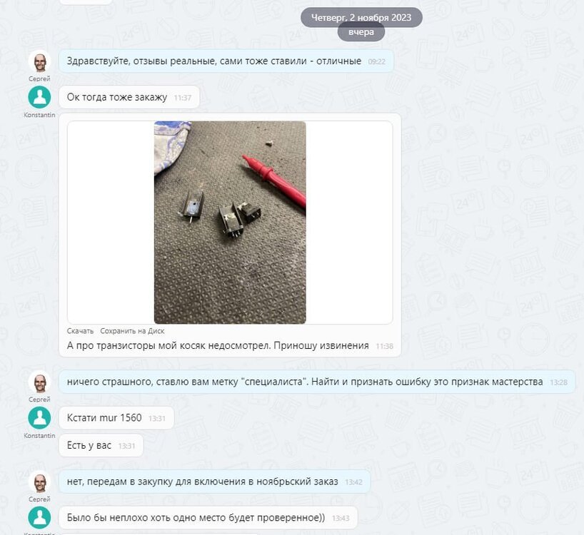 1. Привыкли мы ко всякому с 2009 года, но в последнее время если и обвиняют в подделках, то только новые покупатели и вот прям со скандалом, треском и отборным матом! Пару дней назад обратился к нам в поддержку покупатель четырех БТИЗ GT50JR22, на которых мы уже собаку съели. Так вот - высказал свое подозрение в «леваке». Надо признать сразу – все происходило культурно, без матов и ударов себя в грудь. Касаемо данных транзисторов – ну вот вообще без вариантов! Только в коробках и только напрямую у агента Toshiba и только с целыми фирменными пломбами (на видео выкладывали в канале). Ну не может быть такого!!! Объяснили покупателю, а инженер наш чувствует подвох – человек и про обвязку знает, и осциллограмму готов прислать, и через лампу включал. Но все как-то спокойной проходит. Далеко ходить не будем – на следующий день покупатель написал нам снова и признал свою ошибку, а это, поверьте нашему опыту – крайне редко и очень дорогого стоит. И опять все в спокойной манере. Это я к чему? Десятки отборнейших обращений от "псевдо-мастеров" без доказательной базы приходится в итоге кидать сразу в игнор - с неадекватными невозможно общаться - ты у него спрашиваешь про осциллограф, а его уже не остановить - такие покупатели заносятся в блокировку. Но вот пример достойного общения и сразу результат! Во всем разобрались, виртуально пожали руки, да еще и диоды уже под нашего нового покупателя закупили (MUR1560), причем двух видов - оригинал и хорошие от китайского производителя. Можно, ведь, изначально по-человечески? Как хотелось бы, чтобы относились и к тебе? Так почему бы не начать прямо сейчас и сперва просто спросить? Что станется? Всех с праздником народного единства! Здоровья, успехов и удачи в ремонтах аппаратуры!